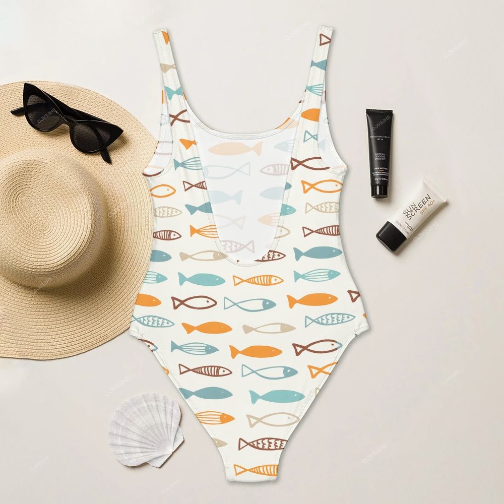 Cartoon Geometric Fish Printed One Piece Swimsuit