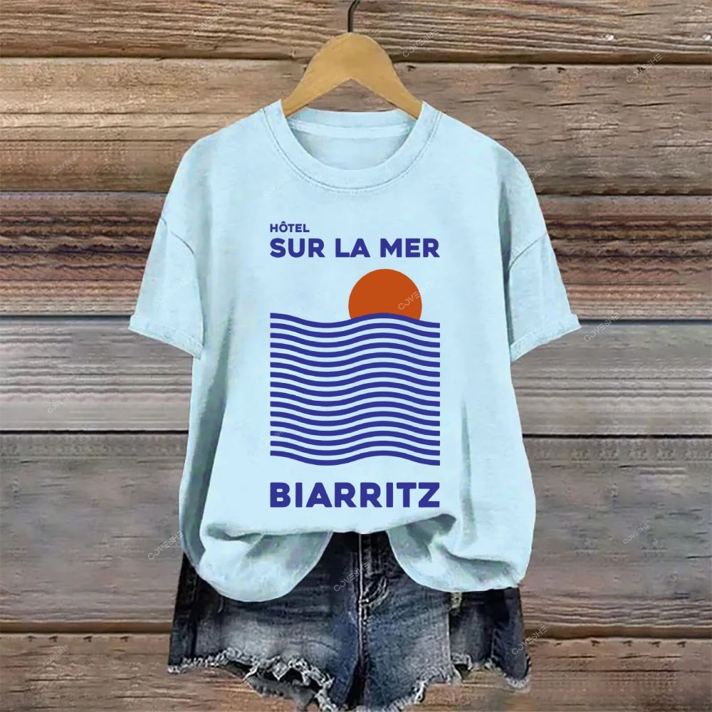 Crew Neck Sea Wave Printed Casual Cotton T-shirt