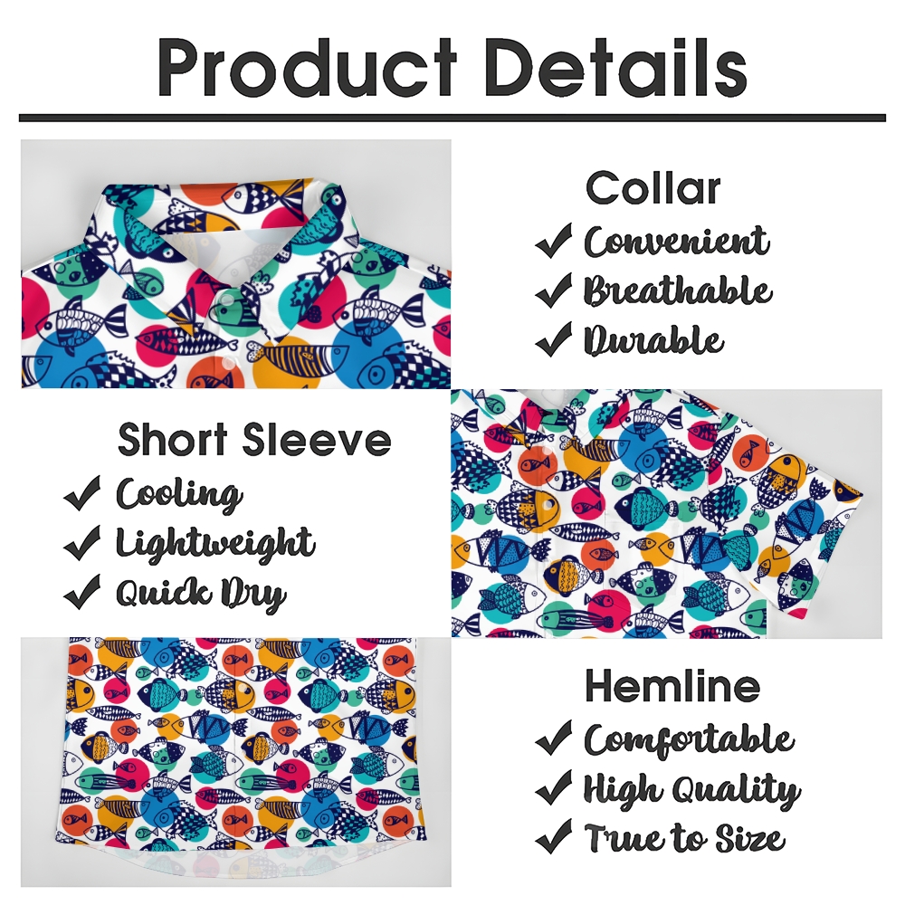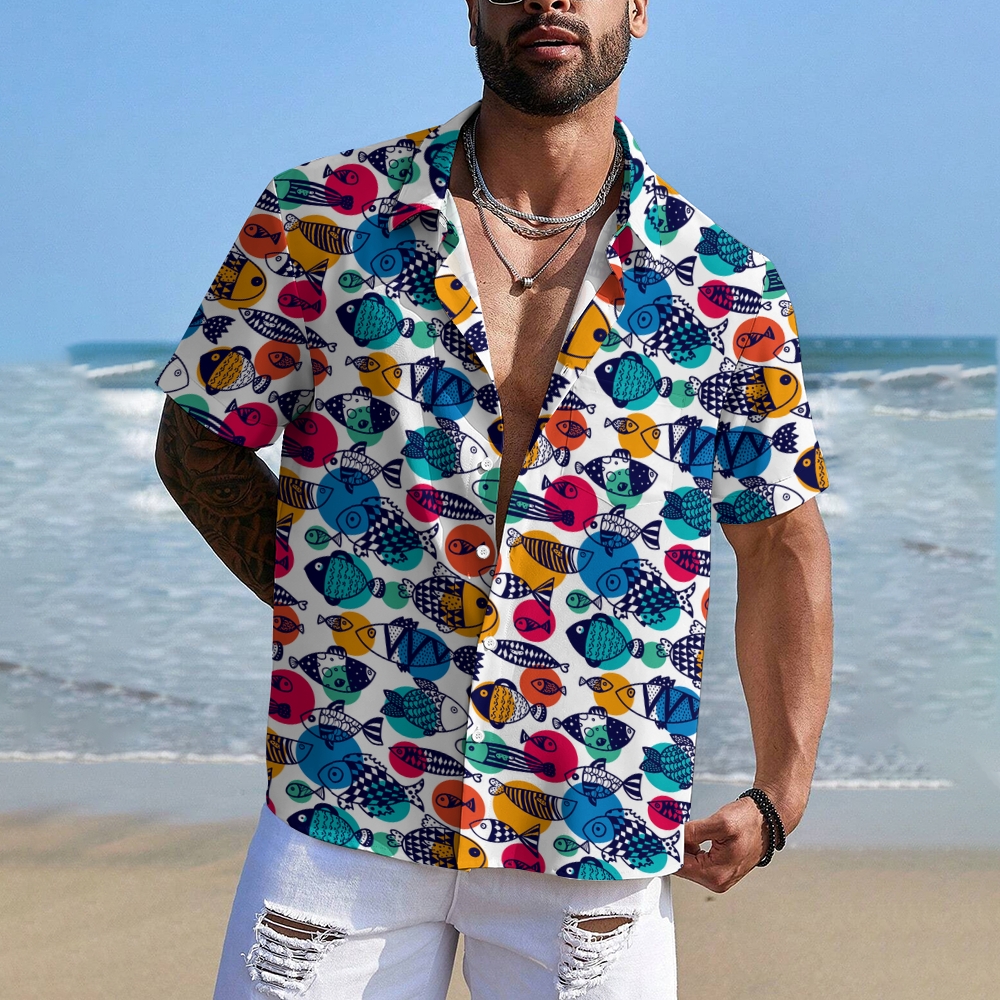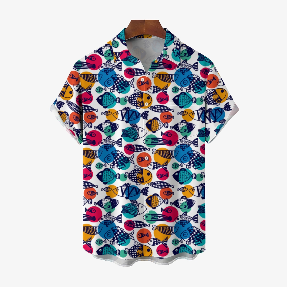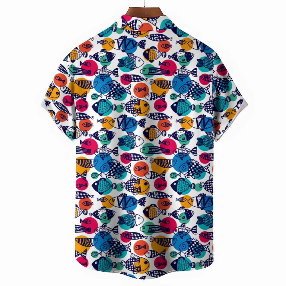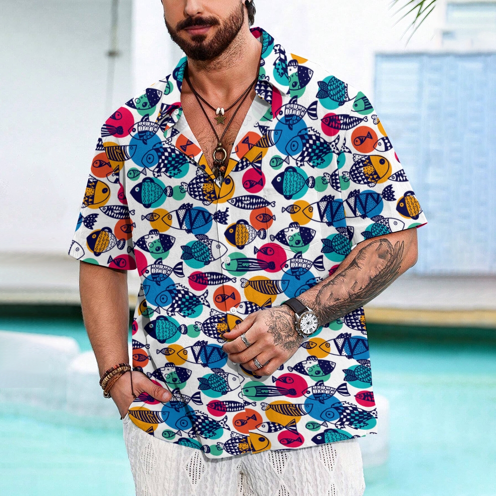 Men's Colorful Cartoon Fish Print Hawaiian Casual Short Sleeve Shirt 2406002043