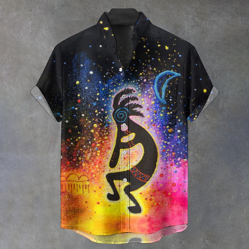 Men's Stand Collar Ethnic Kokopelli Art Print Short Sleeve Shirt