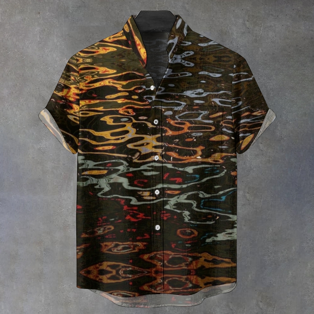 Men's Stand Collar Retro Water Ripples Realistic Printed Casual Shirt