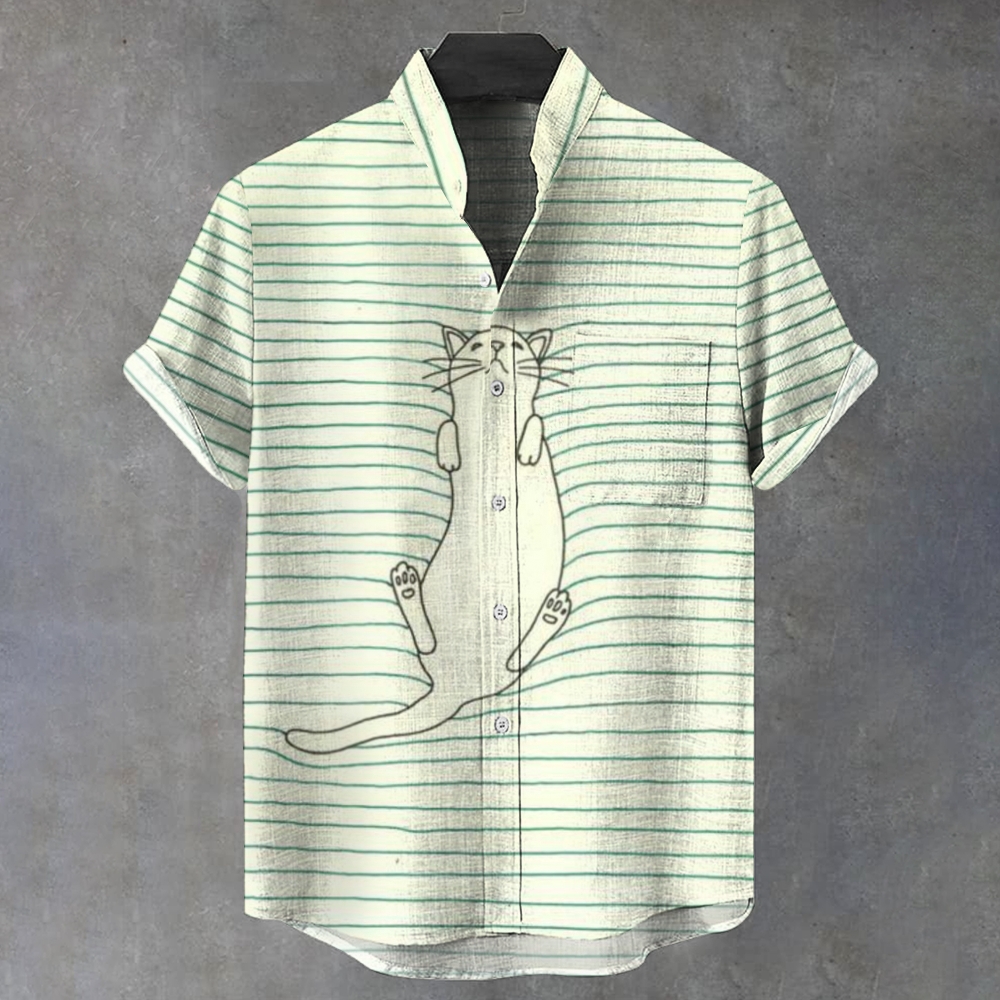 Men's Stand Collar Stripe Cat Printed Short Sleeve Shirt
