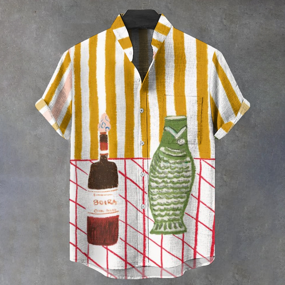 Men's Stand Collar Stripe Wine Fish Printed Short Sleeve Shirt