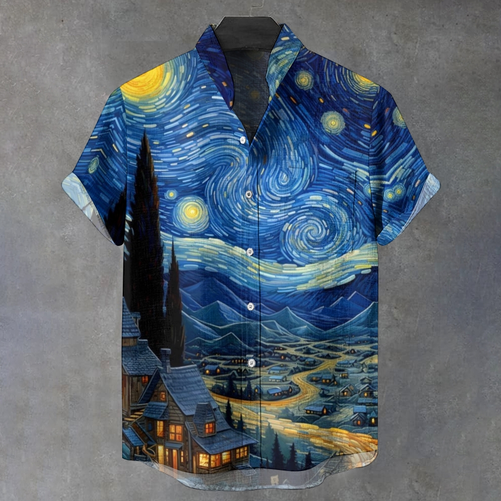 Men's Stand Collar Vintage Vincent Van Gogh Night View Art Printed Short Sleeve Shirt