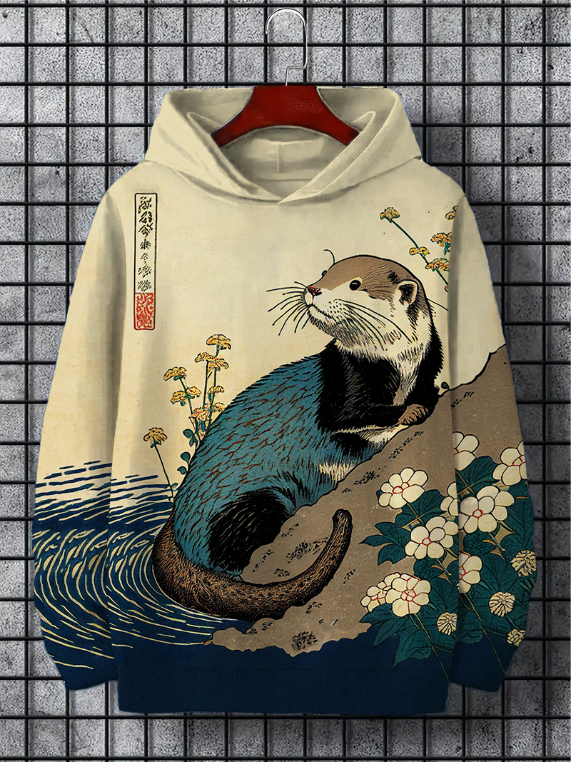 Men's Floral Otter Water Japanese Art Print Casual Hoodie