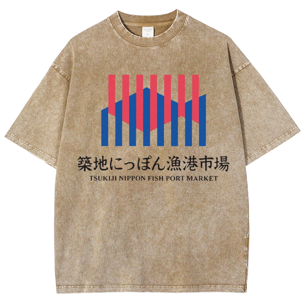 Unisex Japanese Fish Market Printed Washed Tee