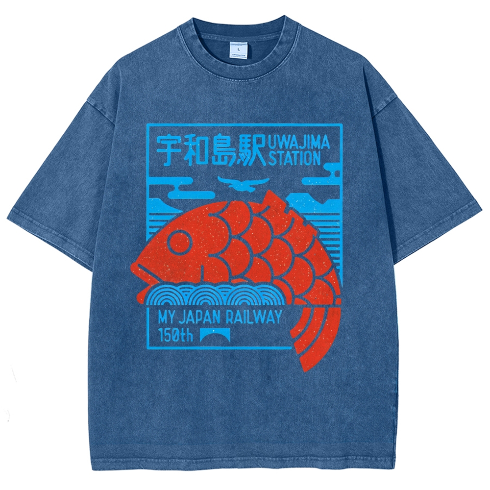 Unisex Japanese Fish Printed Washed Tee