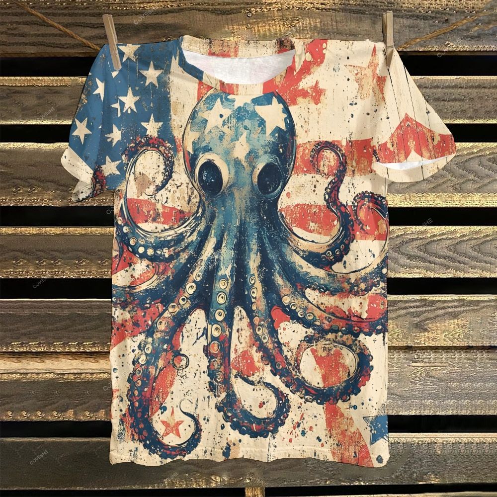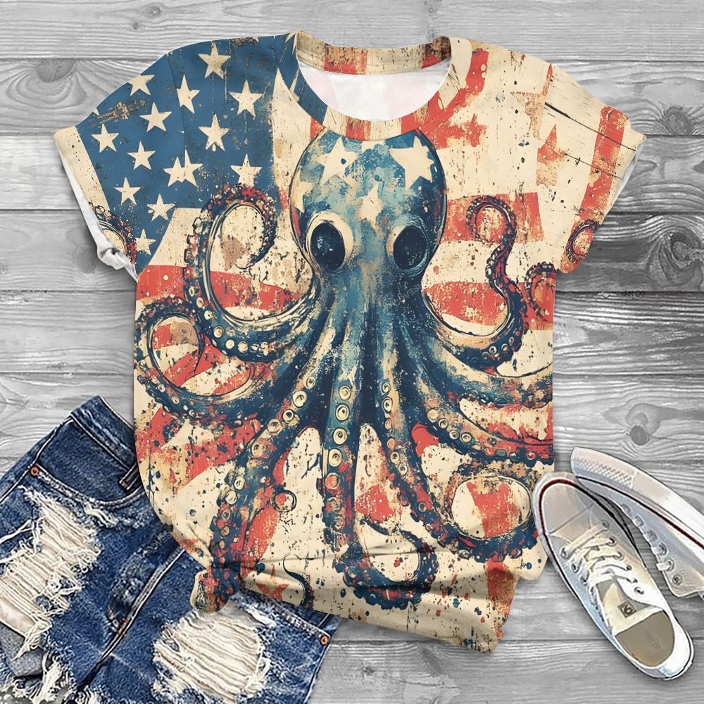 Women's Art Flag Octopus Printed Round Neck T-Shirt