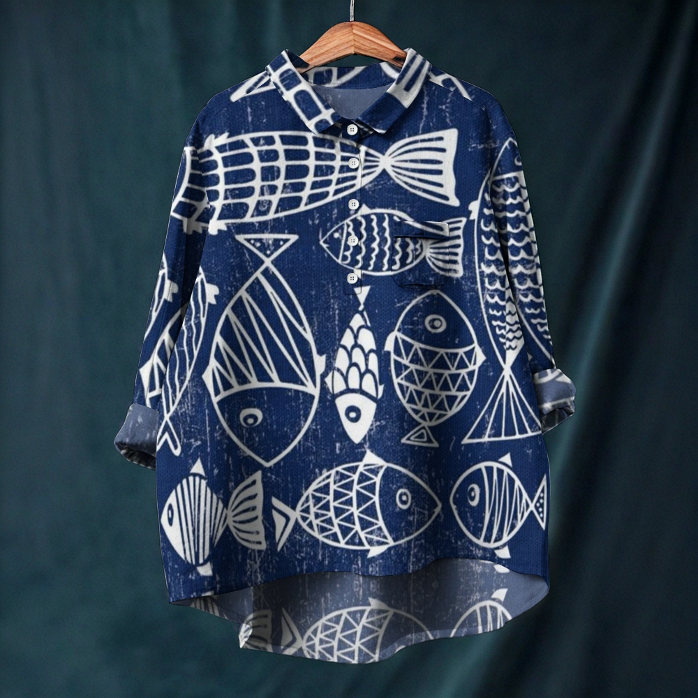 Women's Blue Fish Printed Long Sleeve Casual Shirt
