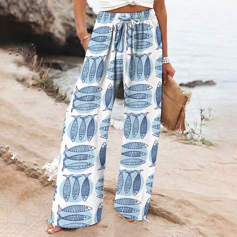 Women's Blue Fish Wide Leg Casual Printed Pants