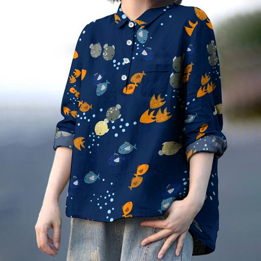 Women's Cartoon Fish Printed Casual Long Sleeve Shirt