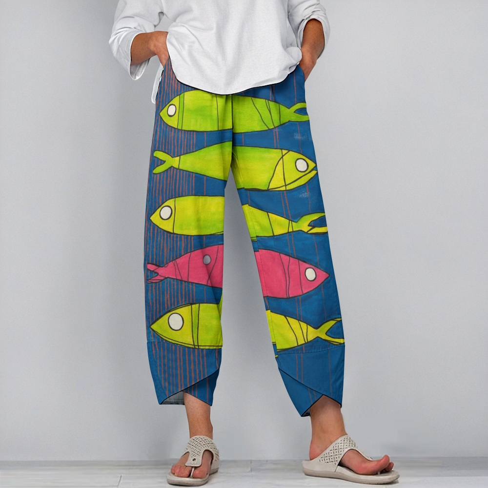 Women's Casual Striped Fluorescent Fish Printed Pants