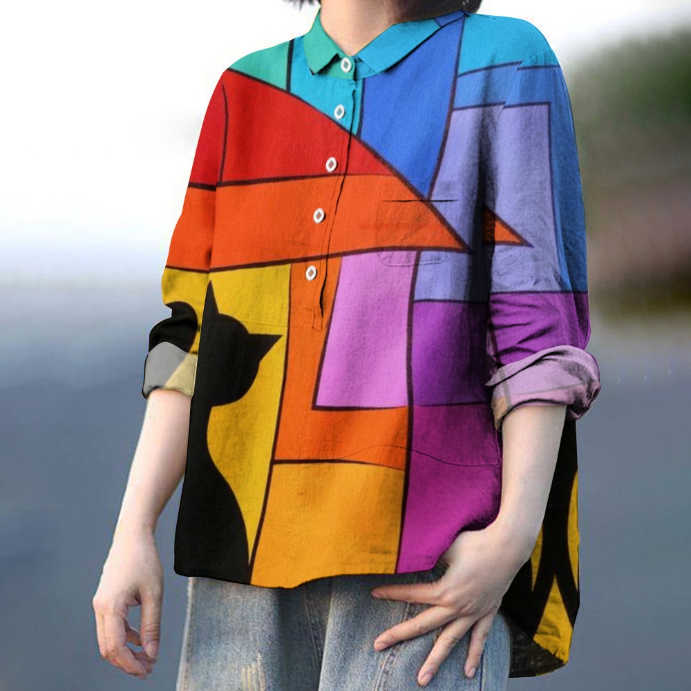Women's Colorblock Cat Printed Casual Shirt