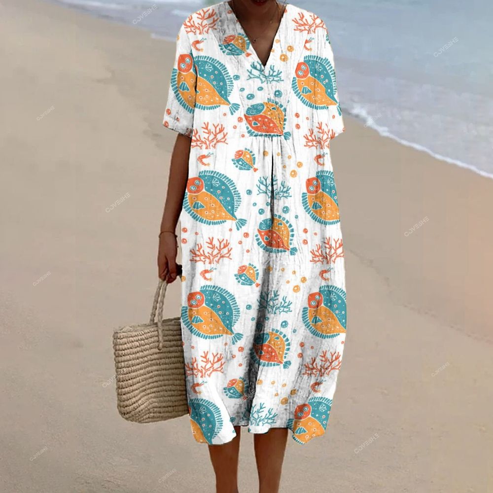 Women's Colorful Cartoon Fish Printed Flowy Dress