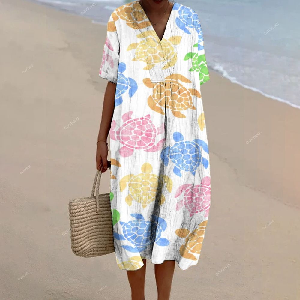 Women's Colorful Cartoon Sea Turtles Printed Flowy Dress