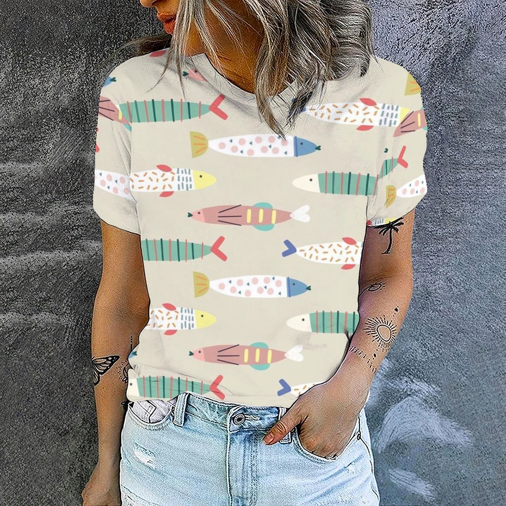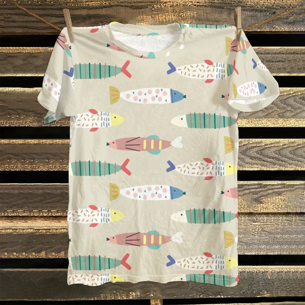 Women's Colorful Geometric Fish Printed Round Neck T-Shirt