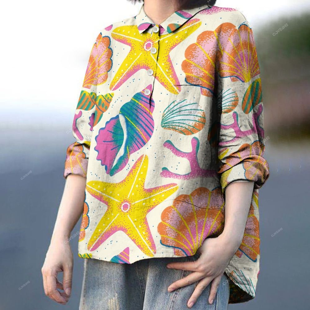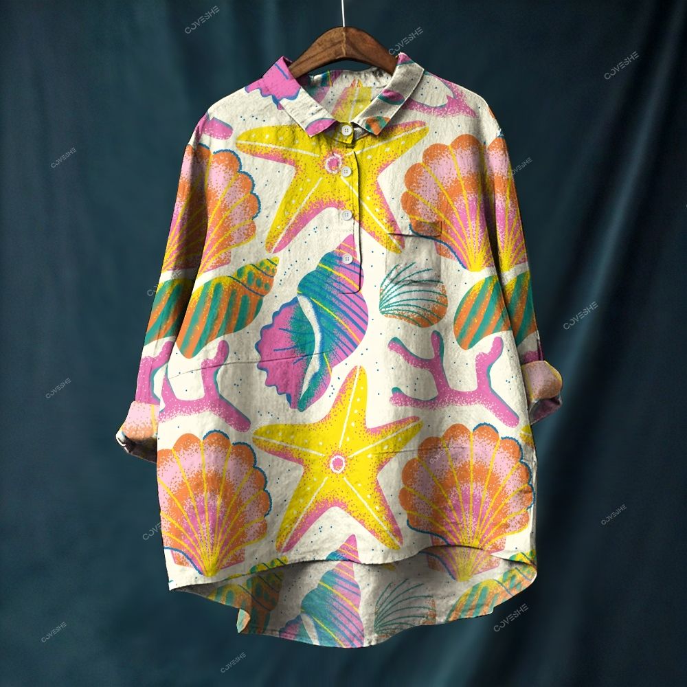 Women's Colorful Starfish Shells Printed Casual Long Sleeve Shirt
