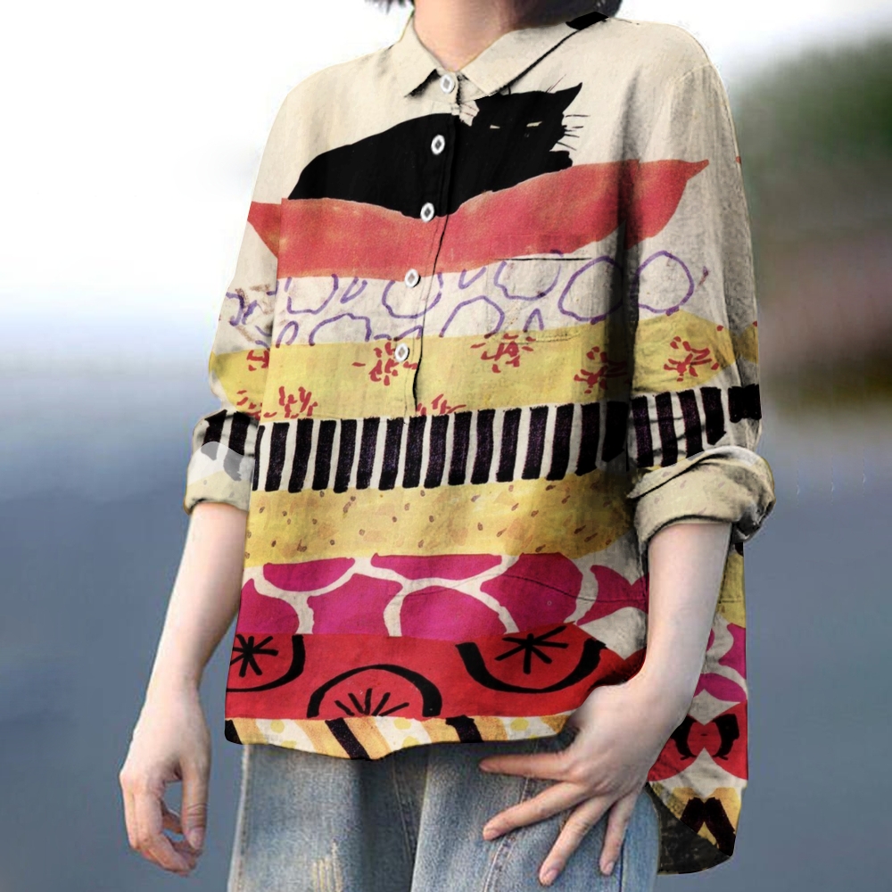 Women's Fun Colorblock Cartoon Cat Printed Casual Shirt