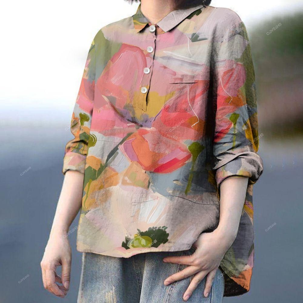 Women's Oil Painting Flowers Printed Casual Long Sleeve Shirt