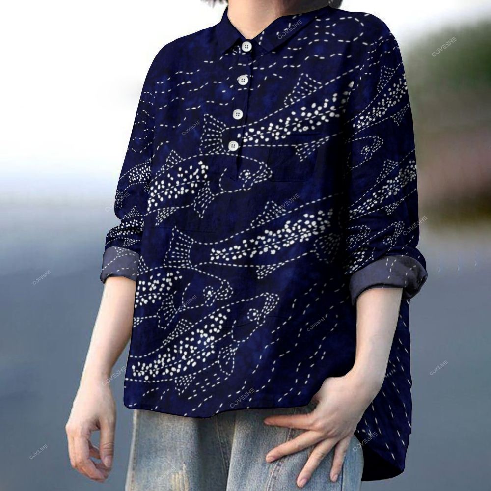Women's Retro Flower Fish Printed Casual Long Sleeve Shirt