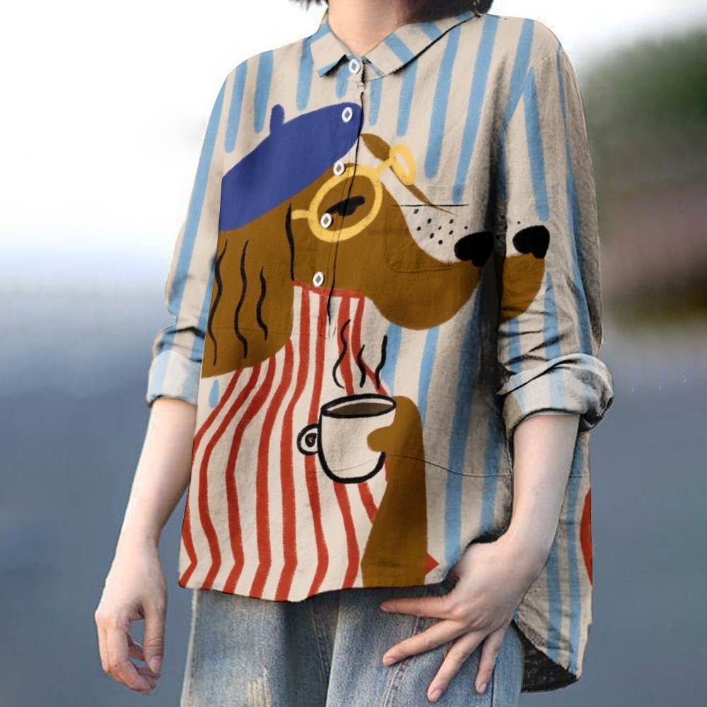 Women's Stripe Cartoon Dog Printed Casual Shirt