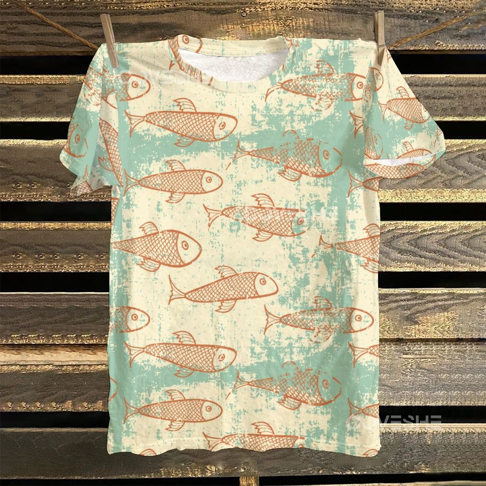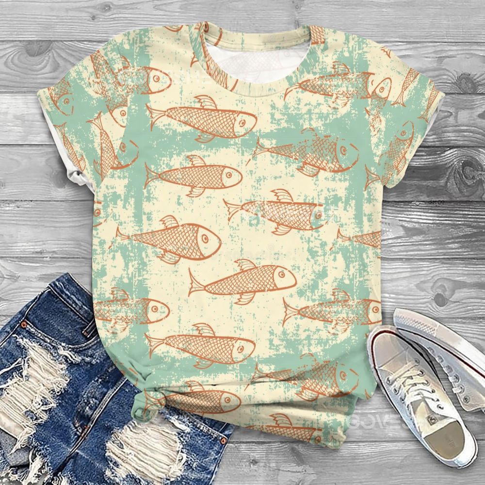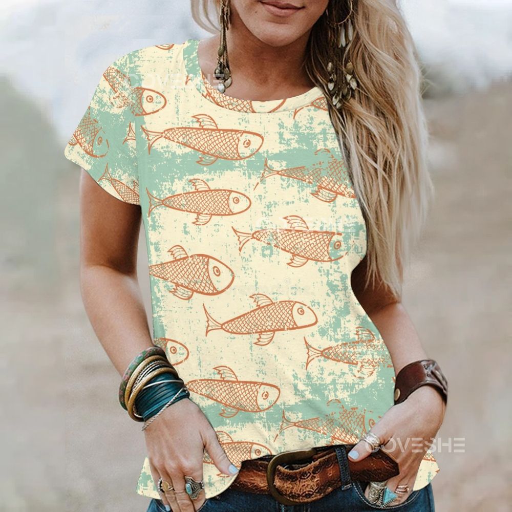 Women's Vintage Geometric Fish Printed Round Neck T-Shirt
