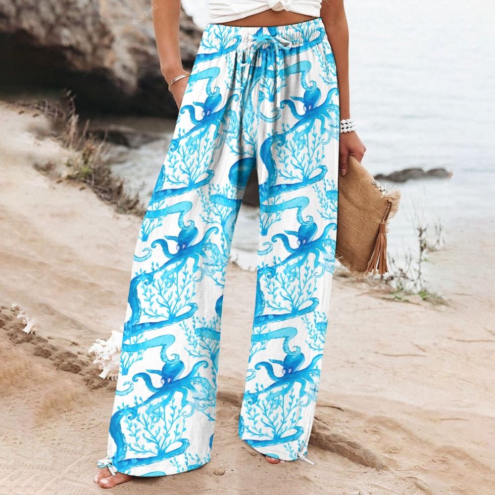Women's Wide Leg Casual Coral Octopus Printed Pants