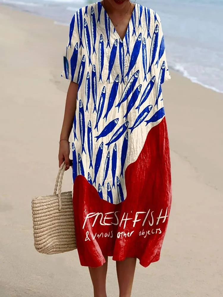 Women's Vintage Fish Sardines Art Print Flowy Dress